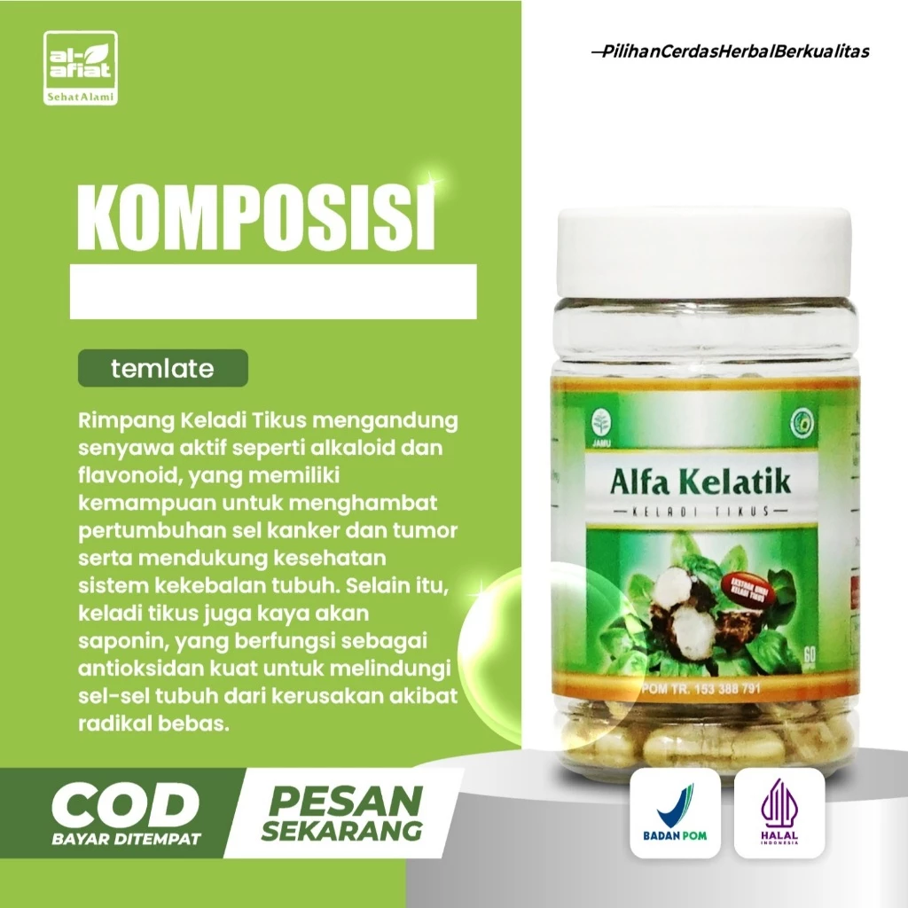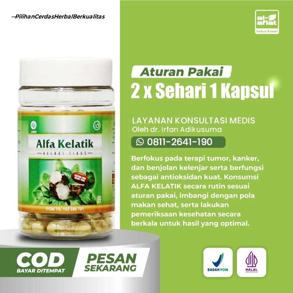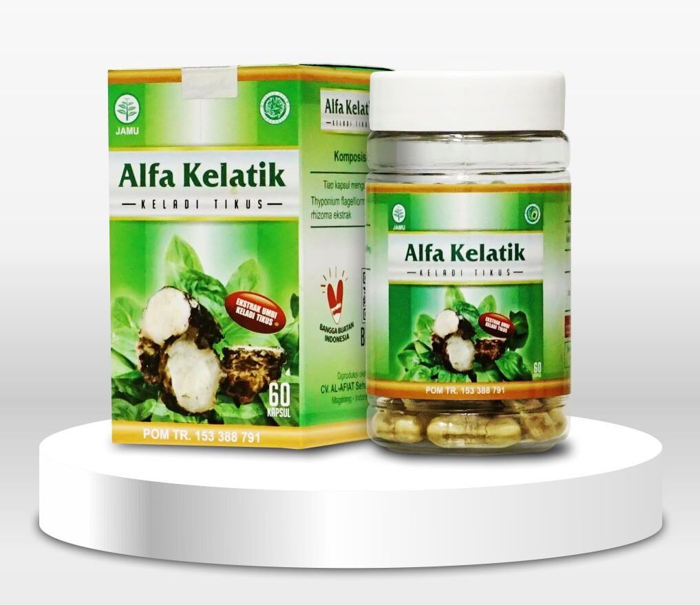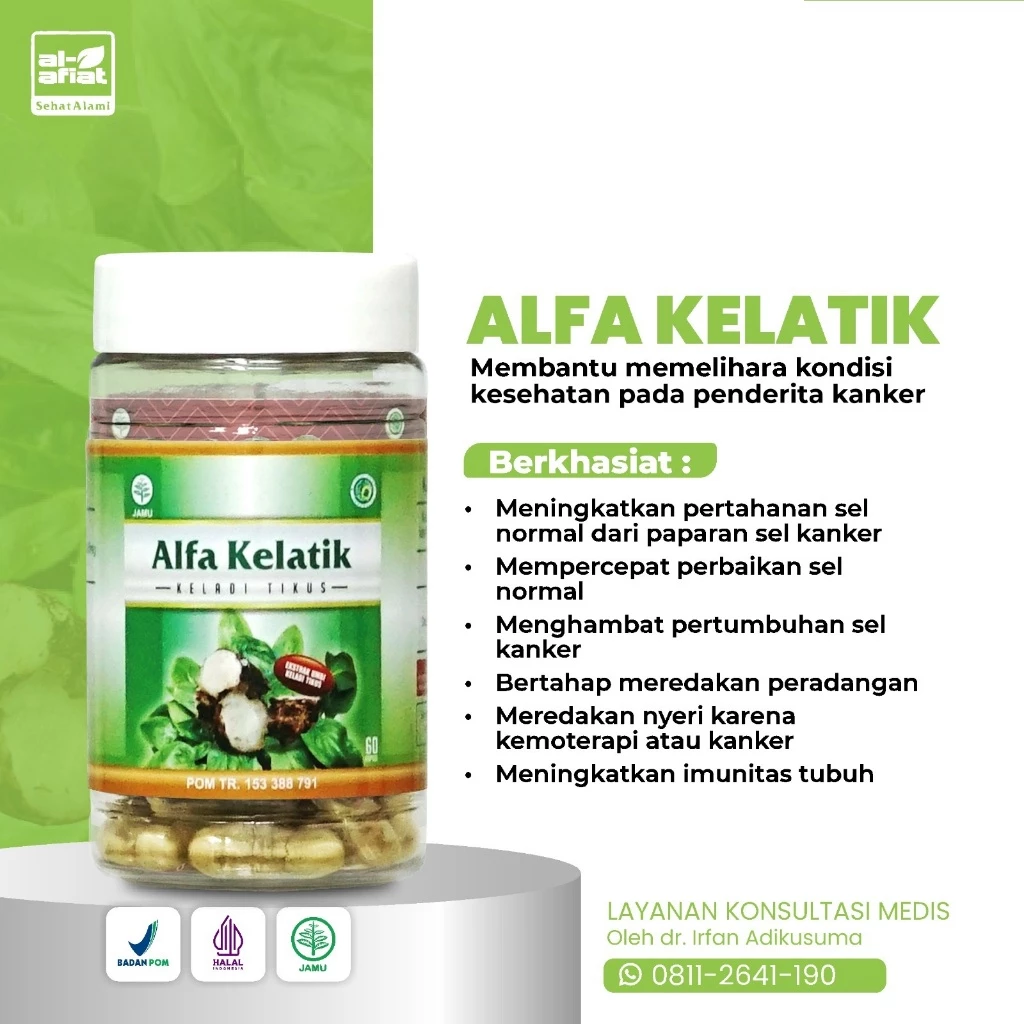 Alfa Kelatik adalah suplemen herbal berbentuk kapsul yang diformulasikan khusus untuk membantu memelihara kondisi kesehatan penderita kanker. Mengandung Thyponium flagelliforme rhizoma (umbi keladi tikus) sebanyak 500 mg per kapsul, tanaman herbal ini telah dikenal secara tradisional memiliki sifat antioksidan dan mendukung proses pemulihan tubuh.