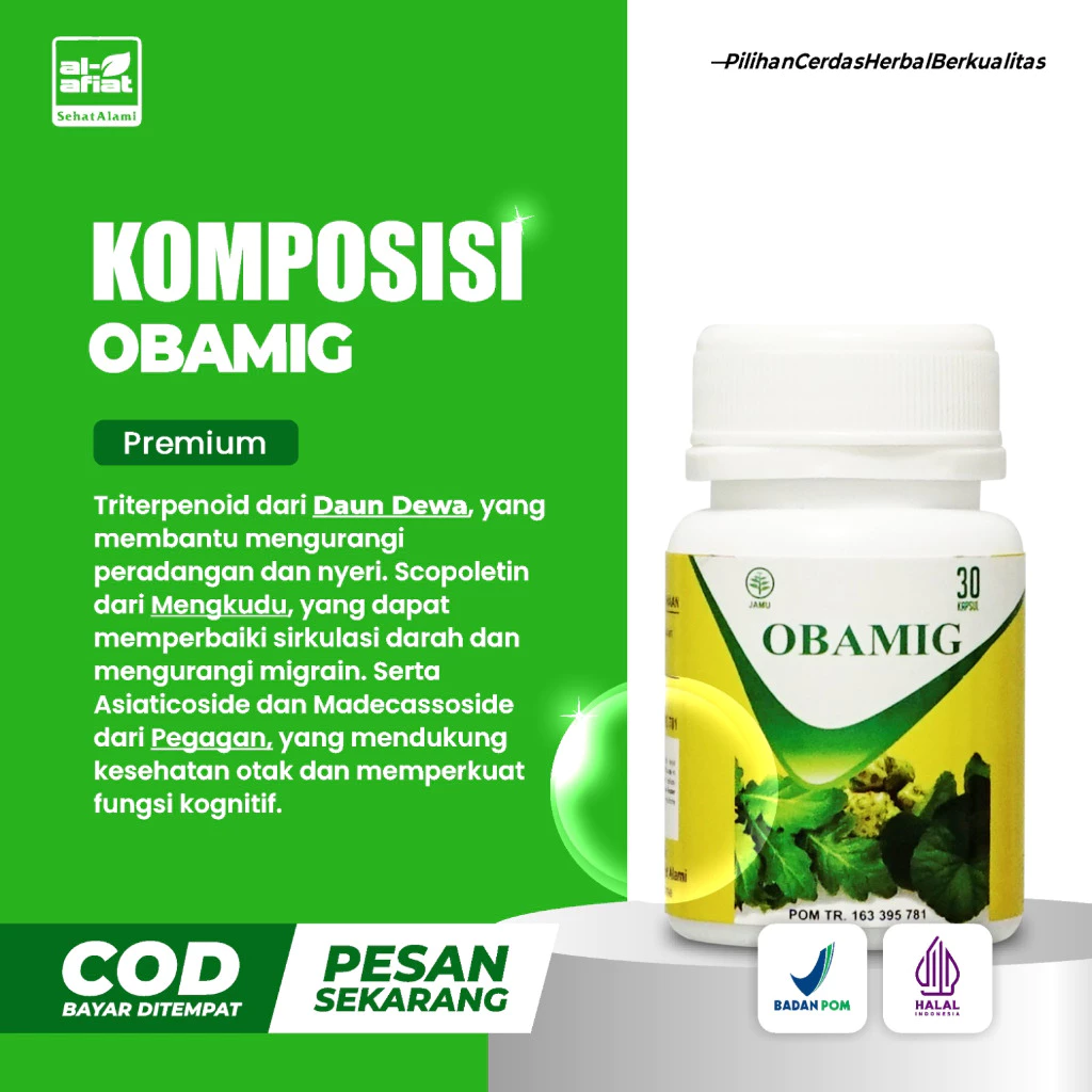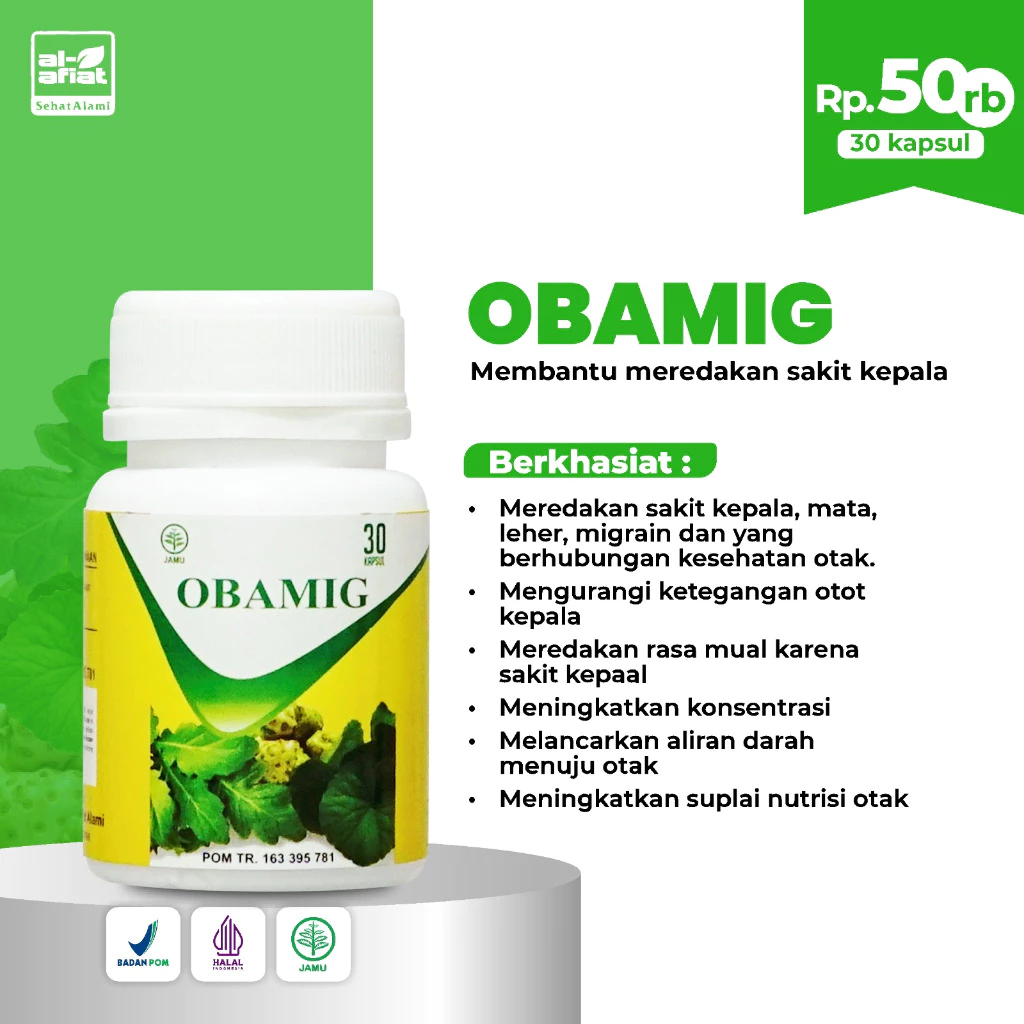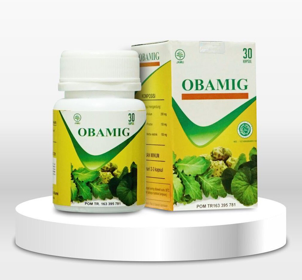 Obamig adalah kapsul herbal alami yang diformulasikan khusus untuk membantu meredakan sakit kepala secara efektif. Dengan kandungan tanaman herbal yang telah lama dikenal dalam pengobatan tradisional, Obamig bekerja dengan cara menenangkan saraf dan melancarkan aliran darah ke otak.